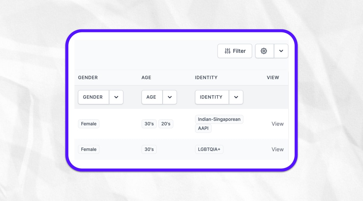 2. You'll be able to filter for age, gender, and identity (race, ethnicity, LGBTQIA+)